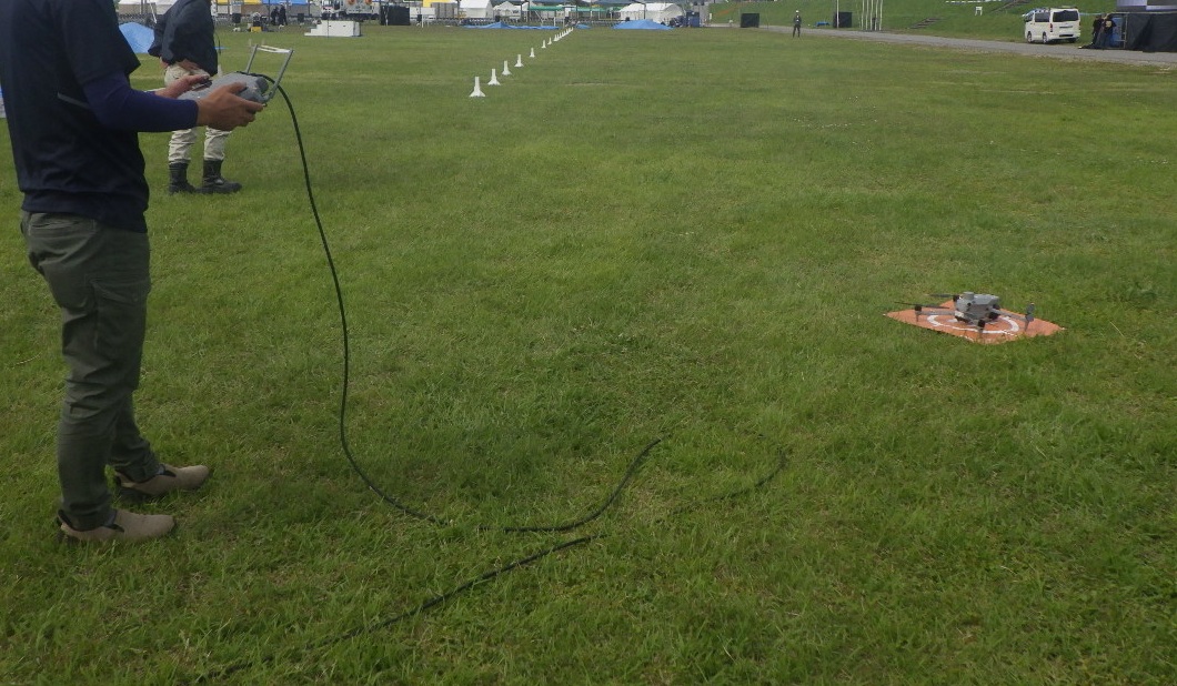 当日はあいにくの雨天となり、ドローンの実飛行は事前に撮影した映像による展示対応となりましたが、 実際の災害を想定した緊張感のある現場を体感し、防災対応の重要性を改めて認識する機会となりました。